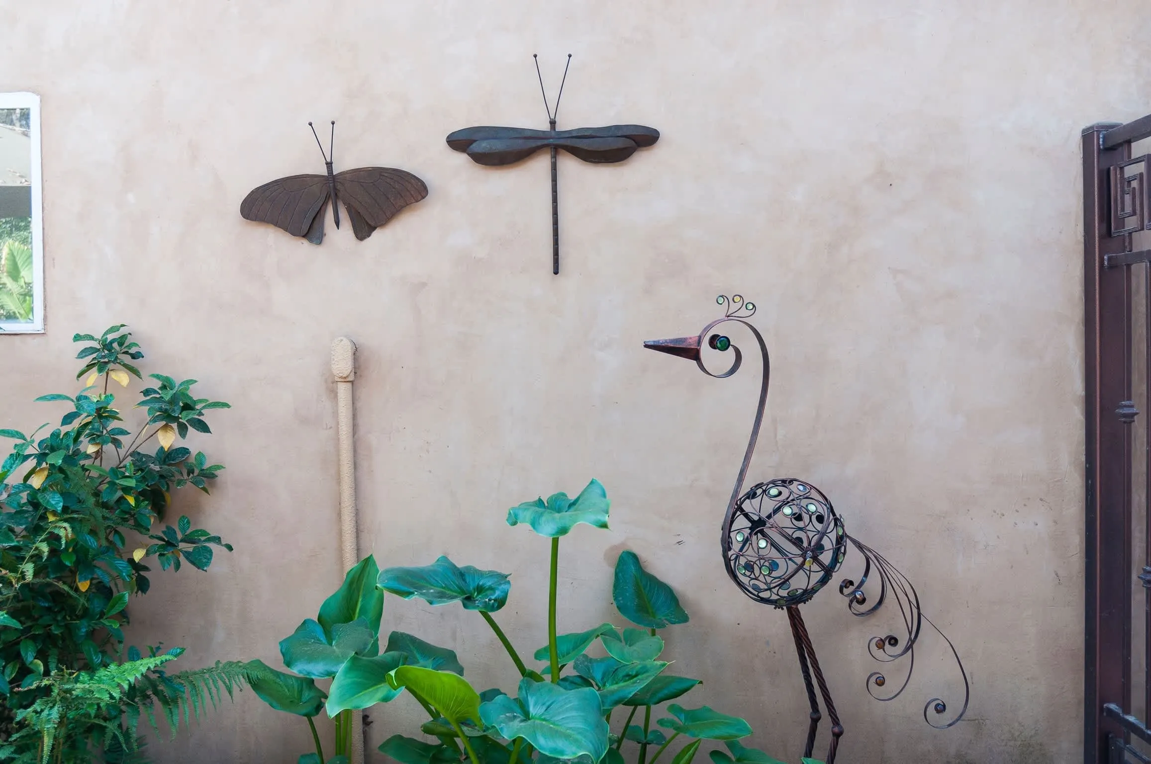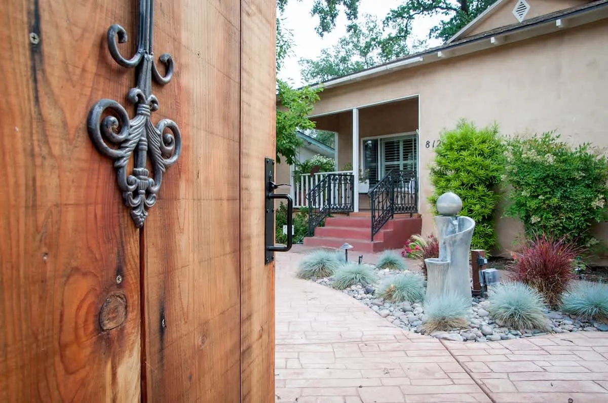 Step inside the huge outside door leading to the front patio and follow the path through the front patio past the boulders, dry creek bed, and desert-scape landscape design. A quaint covered porch leads to the front door of the house.
