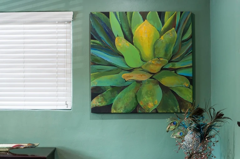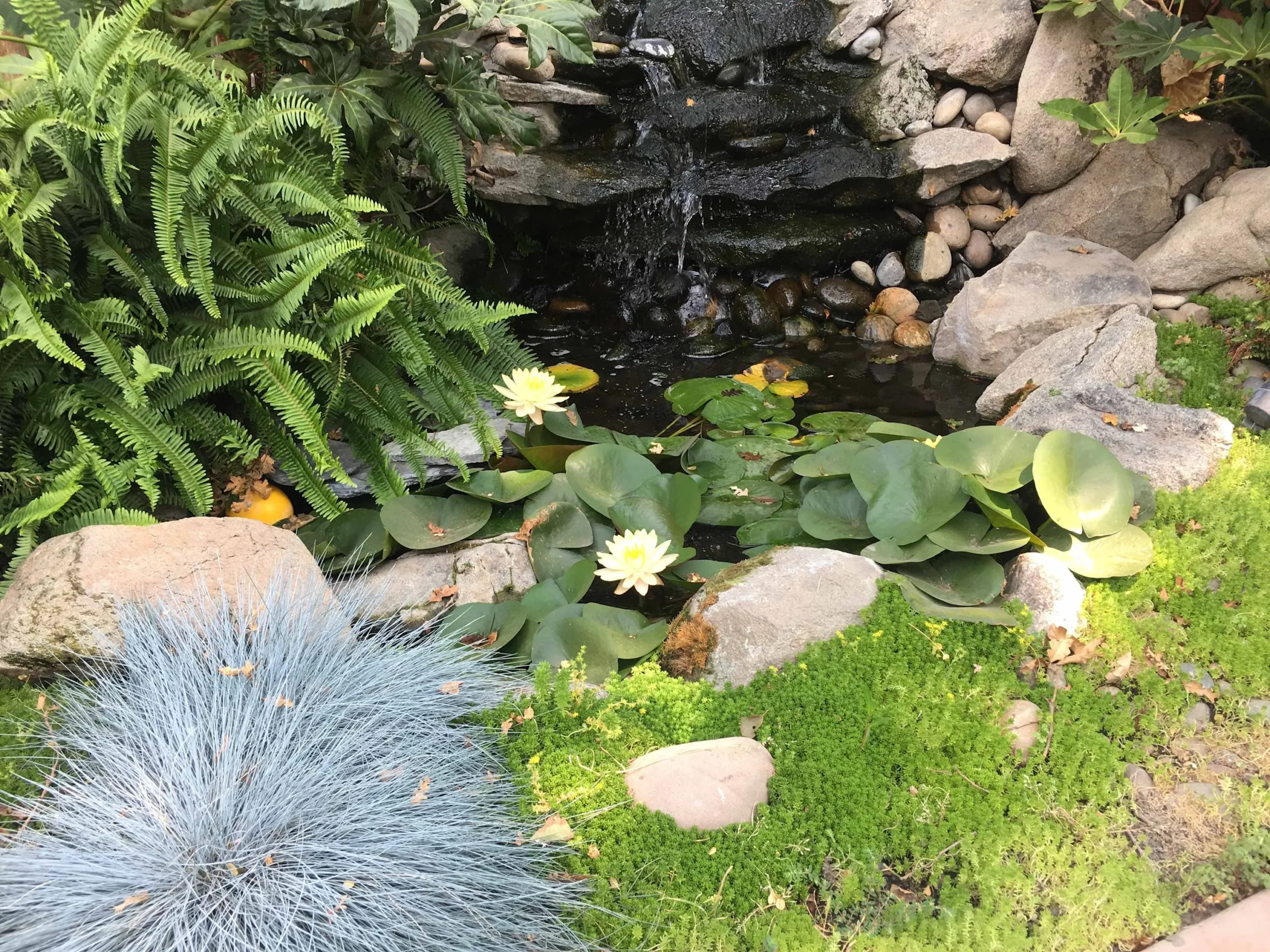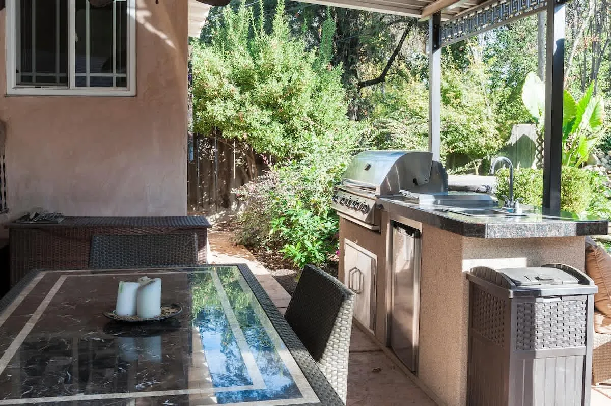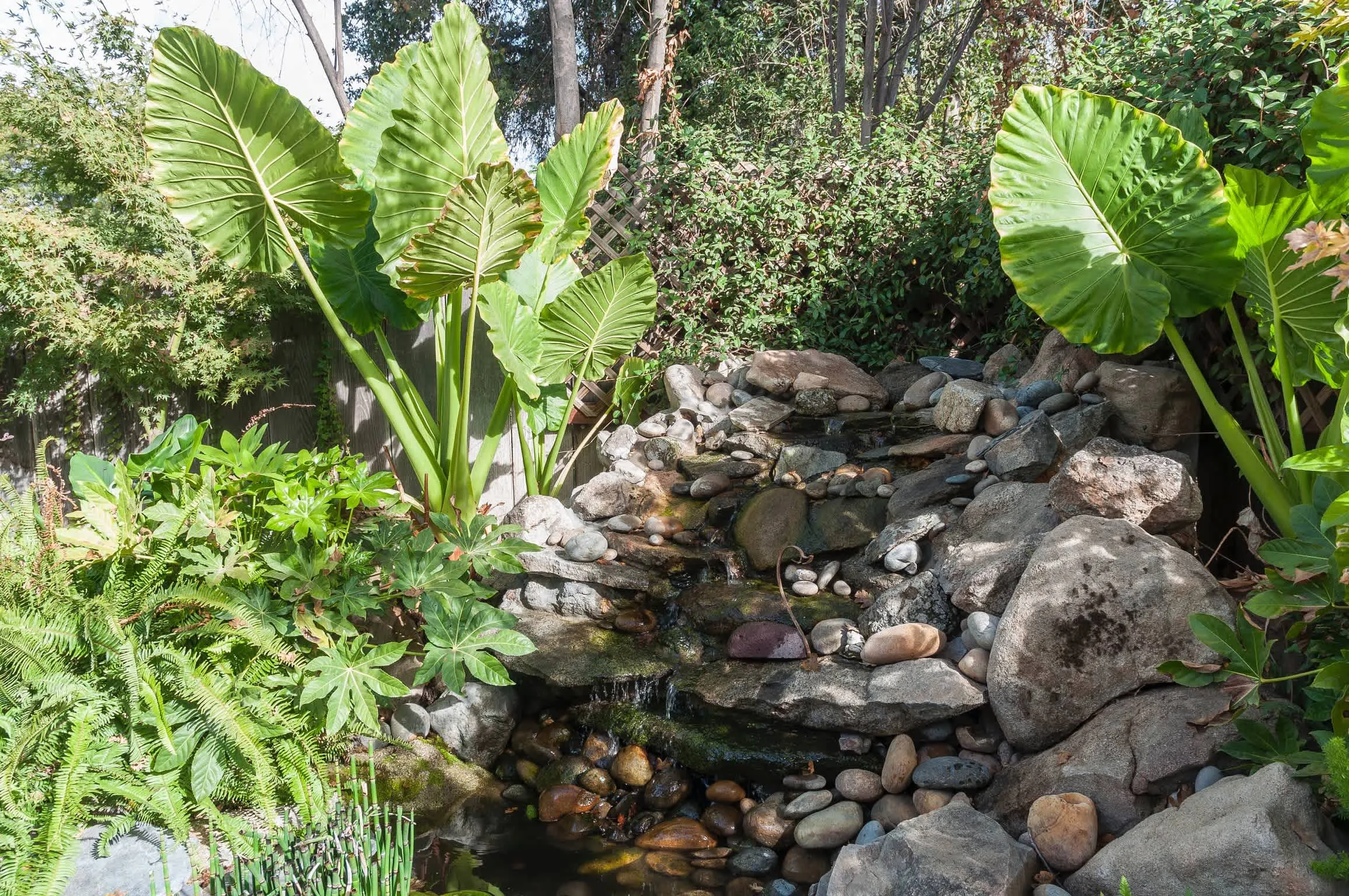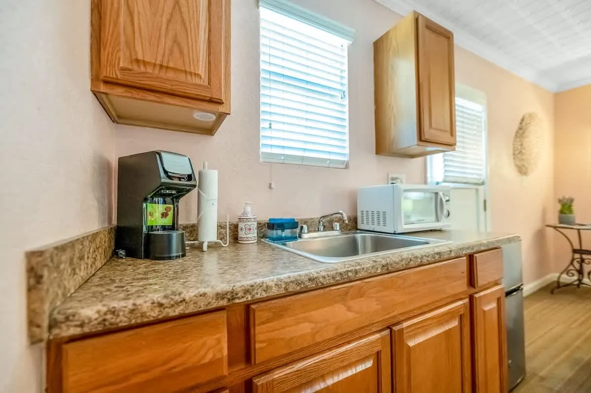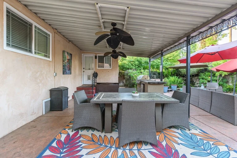 The décor is bright, warm, and welcoming. Through the back window and door, you can enjoy views of the main home’s unique backyard, complete with boulders, waterfall, koi pond, and mature landscaping.