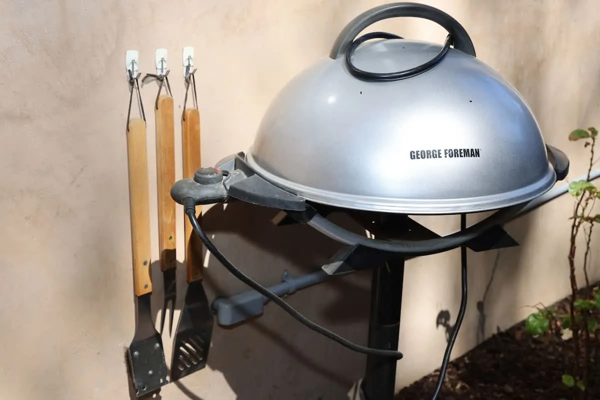 The kitchenette includes an electric pot, microwave, coffee maker, fridge, sink, counter space, dishes, and supplies. There is also a cutting board, seasonings, and a large free-standing George Foreman grill outside the door.