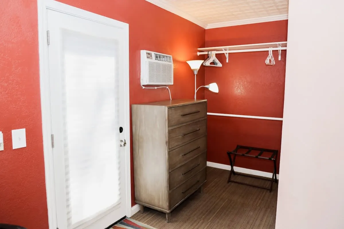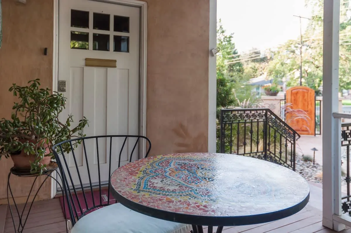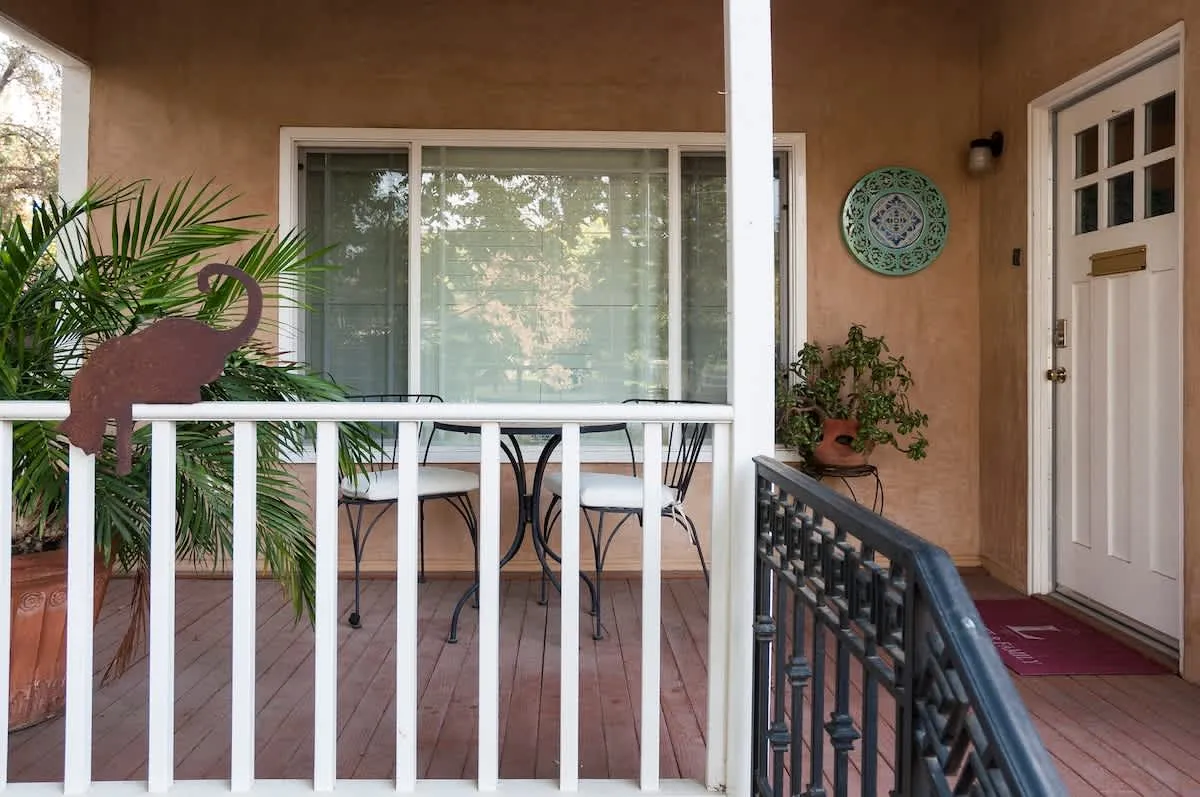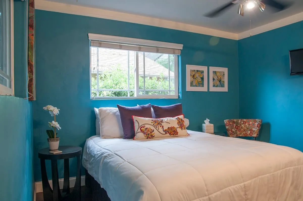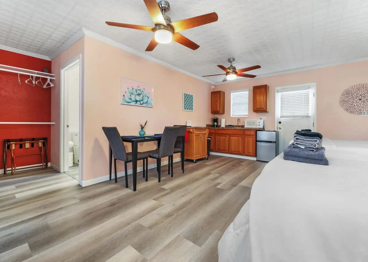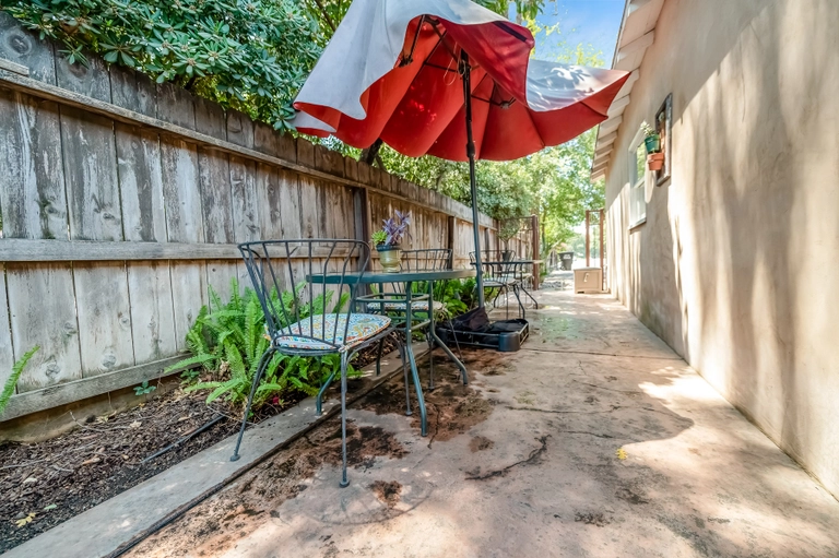 Walk through the south patio to the separate entrance for the Garden Studio Apartment. This large space features a functional kitchenette, a dining table for four, and two queen beds. There is a bathroom with a shower, and the back door opens directly onto the back patio of the main home.