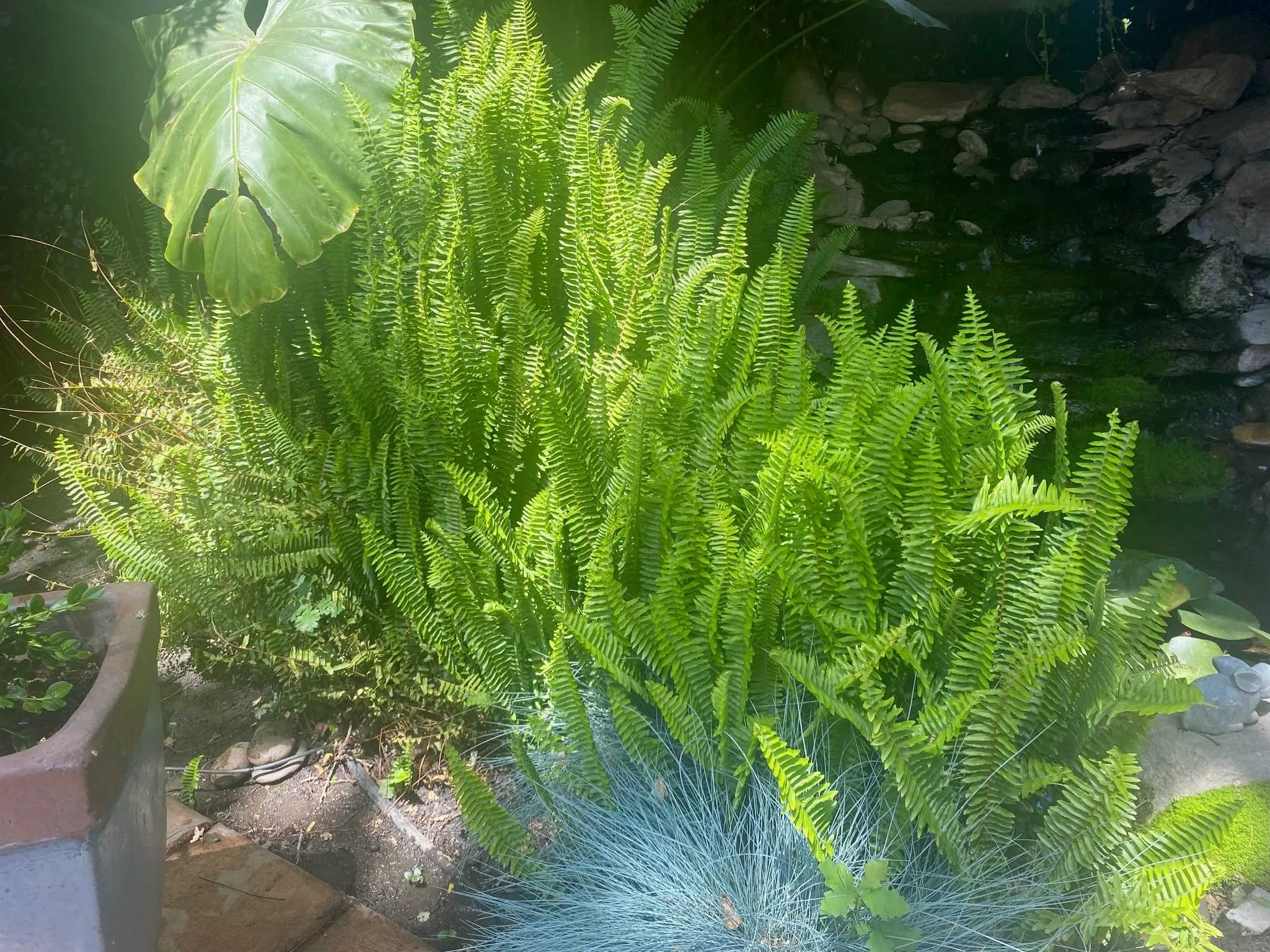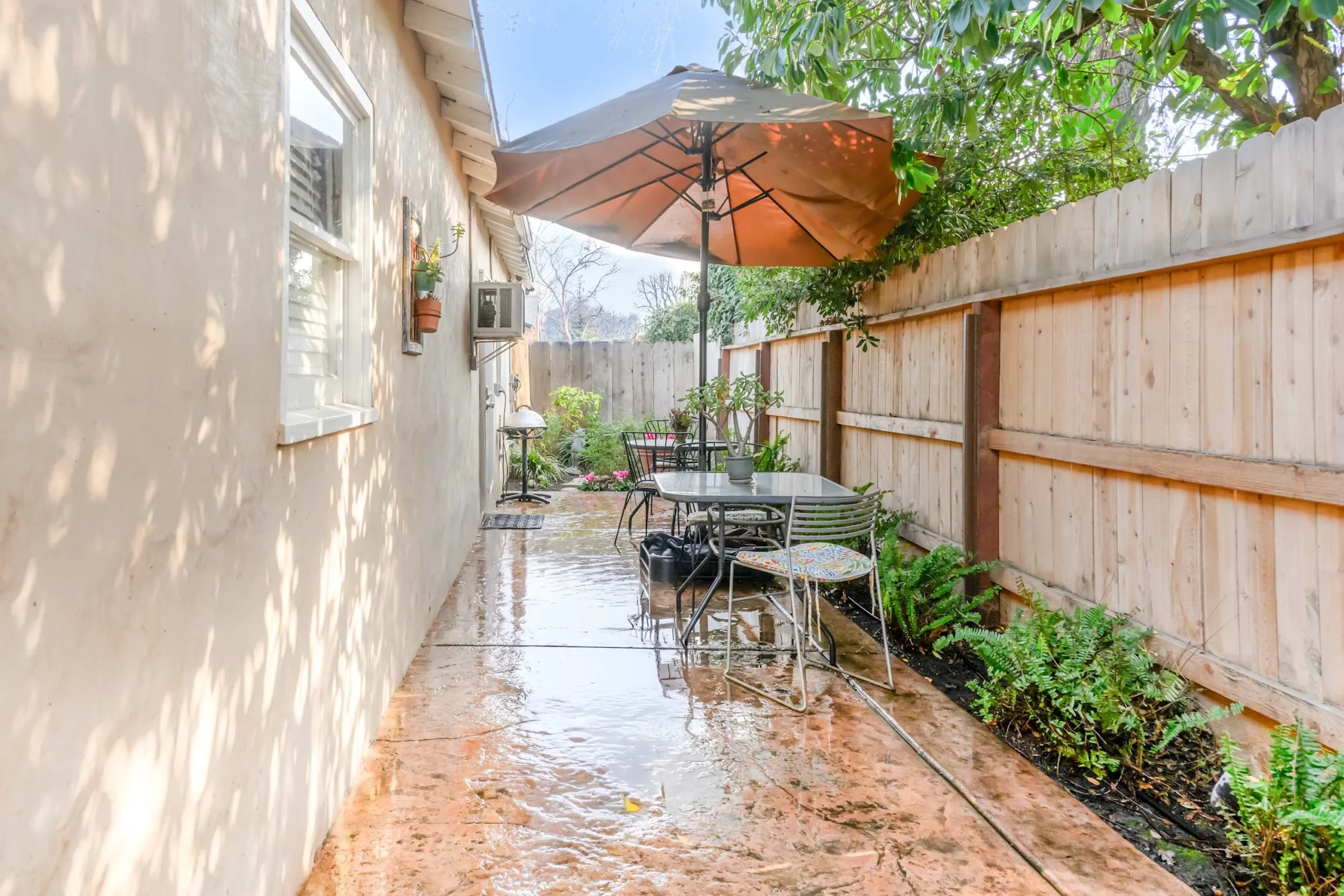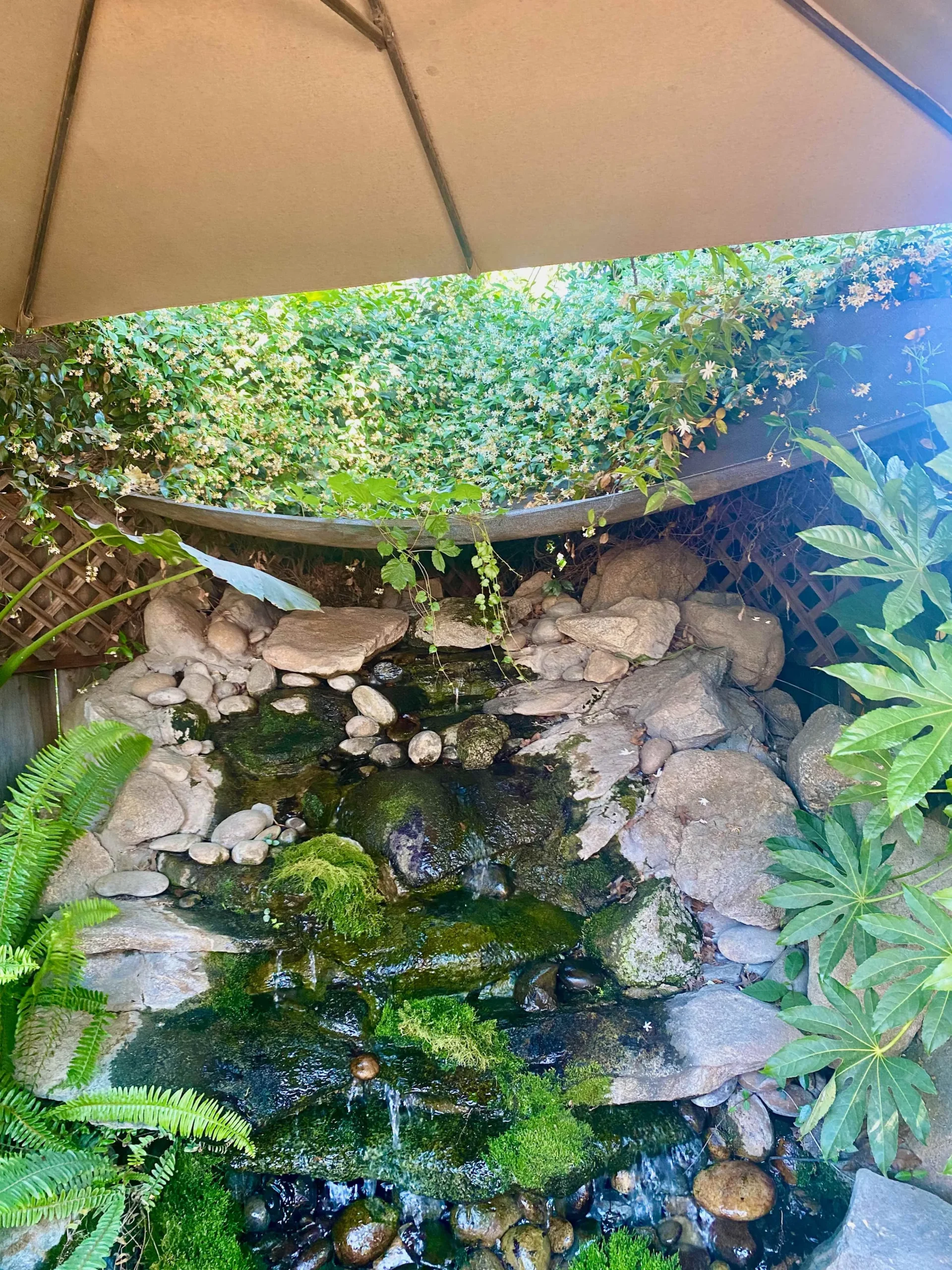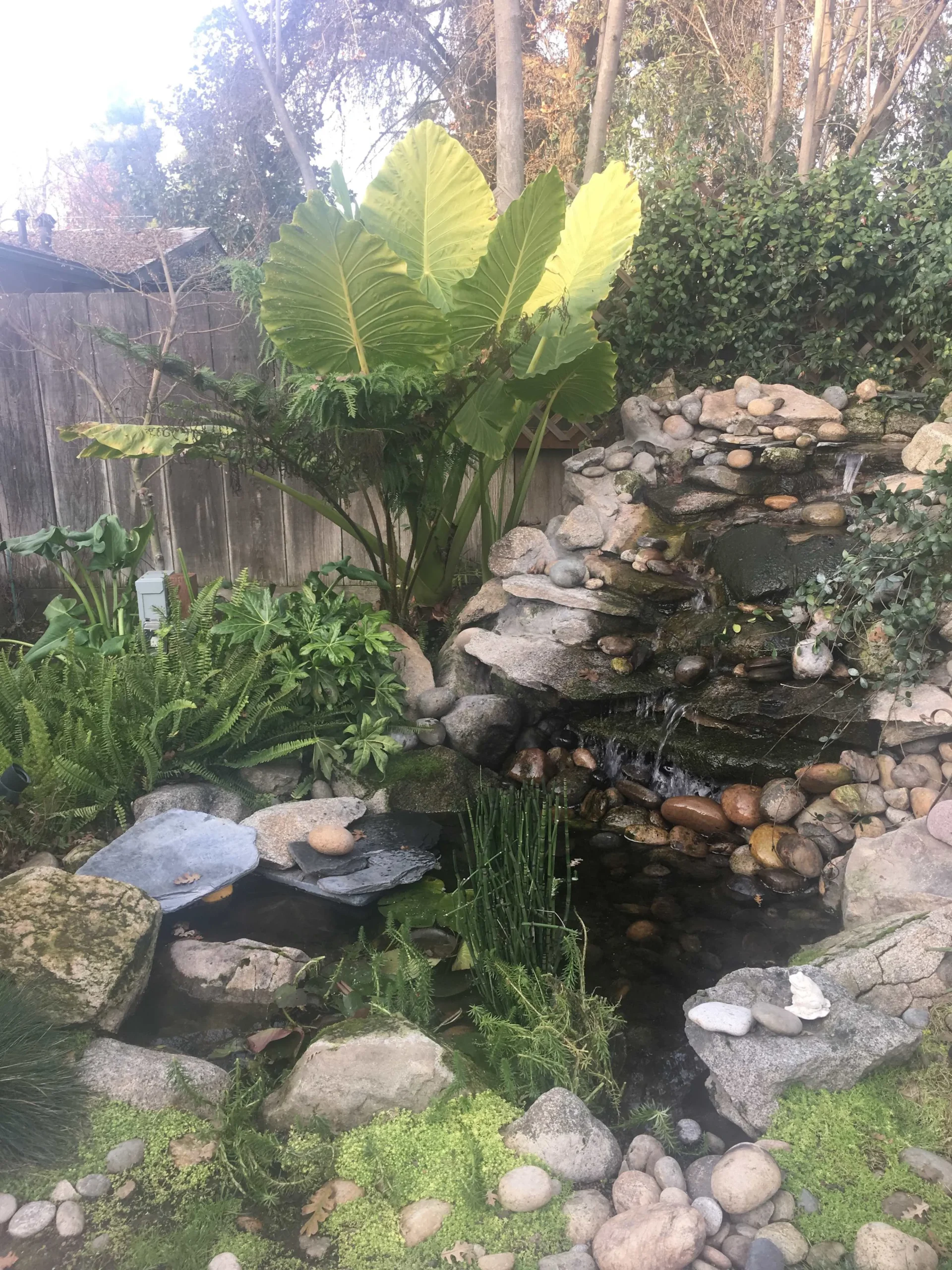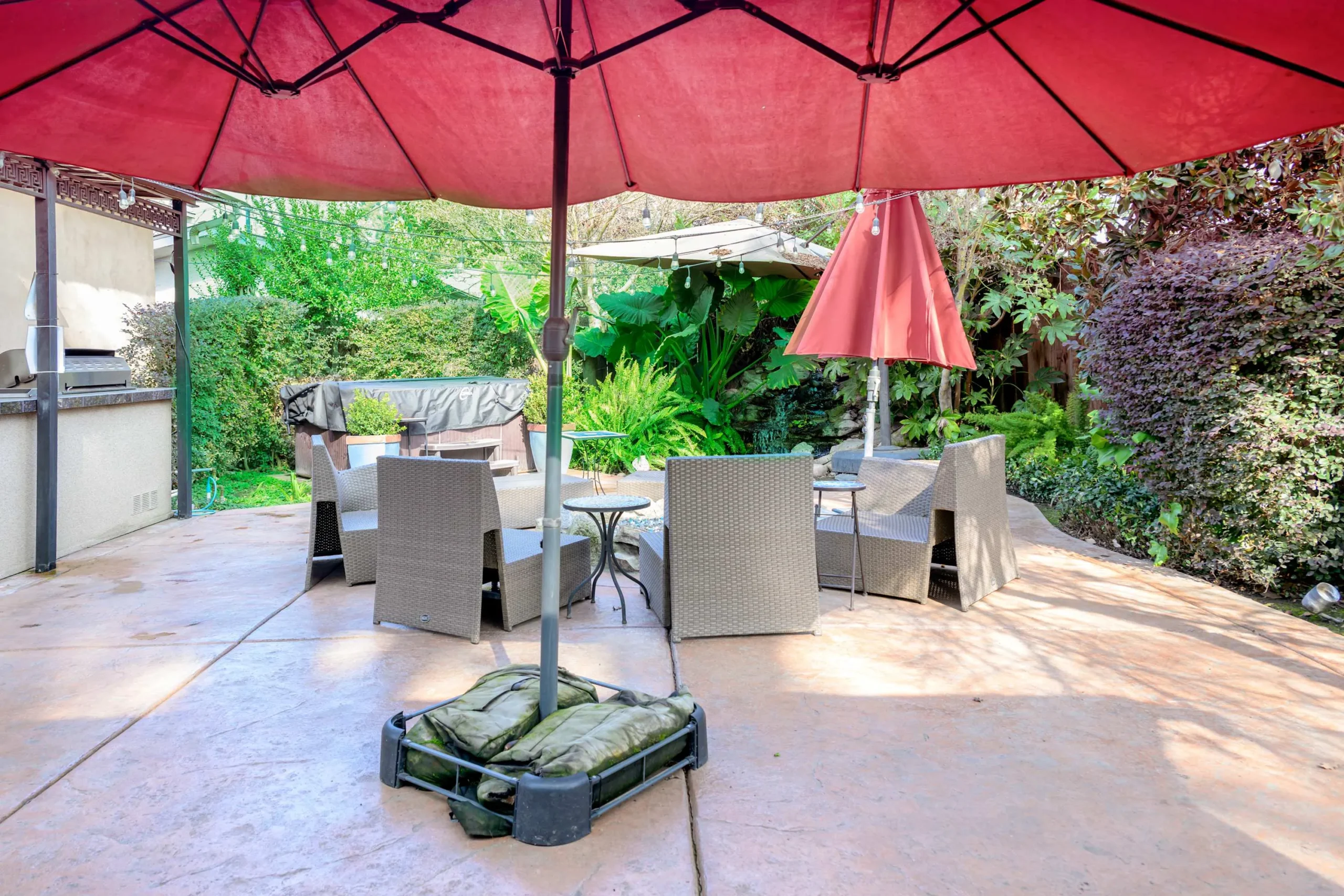 In the summer, you will appreciate the shade on the back patio and the coolness of the water feature. You might even take a dip in the unheated very large hot tub to cool off.